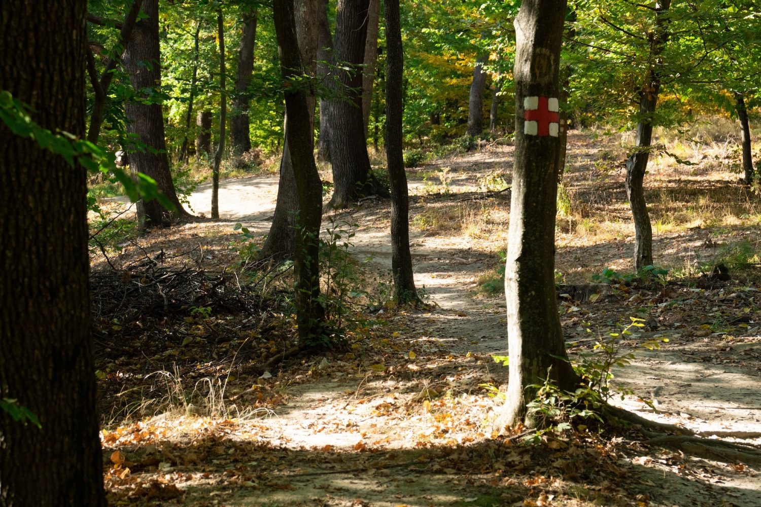 The easiest way to start exploring this area is to get to Releu, which is a large clearing next to the forest on top of the hill, and you’ll have to get there by car as there are no buses, and then go into the forest to the South and follow the marked route (the Eastern, orange line route here, marked with a Red Cross on White in real life). The route keeps going for 15+ km all together, up and down 2 or 3 hills, and it intersects many other routes, forest roads and trails, markets or unmarked, but you don’t have to go this deep if you’re just testing it. Run into the forest for 2-3 km, come back, and repeat. In good weather on summer days, and especially on weekends, Releu itself and the edge of the forest might be relatively crowded, but go a kilometer or so in and you’ll find much more solitude.