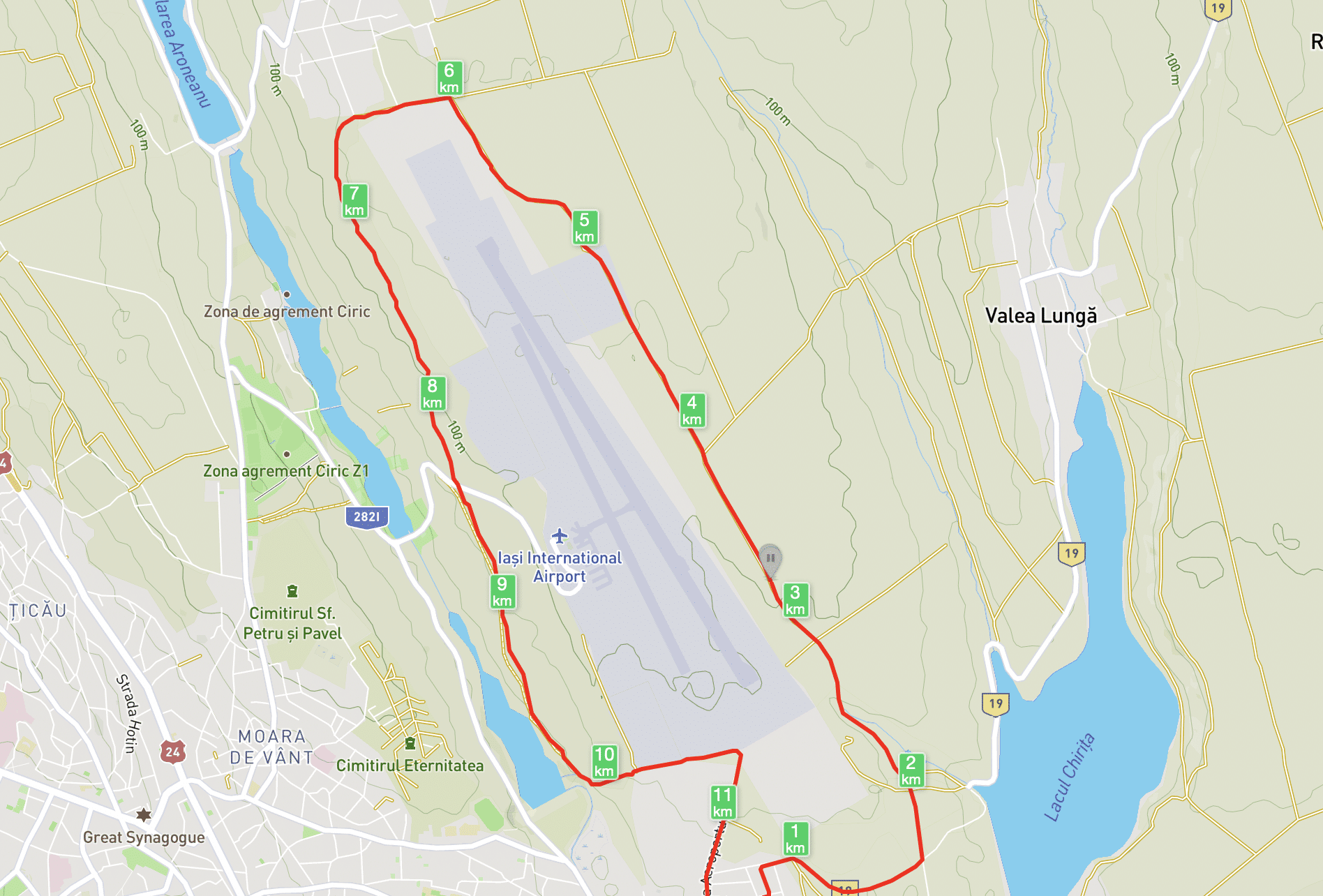 Or, if you want to extend it, don’t stop at the end of the forest. Continue East on the little dirt road right next to the Airport fence, have the runway to your right and do a bit of plane spotting too if you’re into that. Take a right and follow the airport fence then continue on the dirt road heading South until you’re back in the City coming from another side, go back North alongside the military base and then make a left and end up back where you started, at the base of Lake Veneția. This route is 11-ish km and 150-ish m total climb. If you want something even longer, go explore any of the dirt roads you see to the East, all the way to Lake Chirița and the Valea Lungă village. Nobody will mind you running on any of the agricultural roads and trails anywhere in that area, as long as you don’t actually start running over the crops, which you have no reason to.